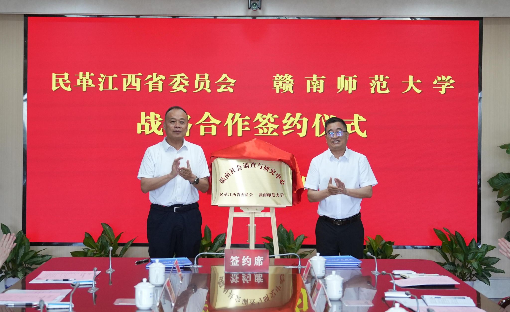 王宗德和舒铭东代表双方签署战略合作协议书。罗序中和熊皓代表双方共同为“赣南社会调查与研究中心”揭牌。
